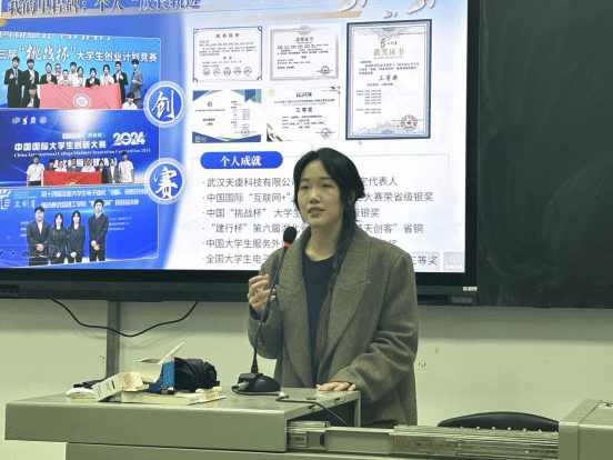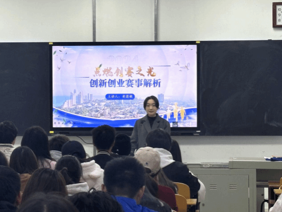 活动当天,文法学院301教室座无虚席。校青年创新创业发展中心主席黄蒲敏做赛事解析,她强调创新创业教育的重要性,并概述了“卓越杯”创新创业大赛、中国国际大学生创新大赛等赛事亮点。她鼓励同学们积极参与实践,丰富大学生活,同时详细阐述了创业扶持政策和项目基地入驻流程,彰显了国家与学校对学生创新创业能力培养的高度重视。