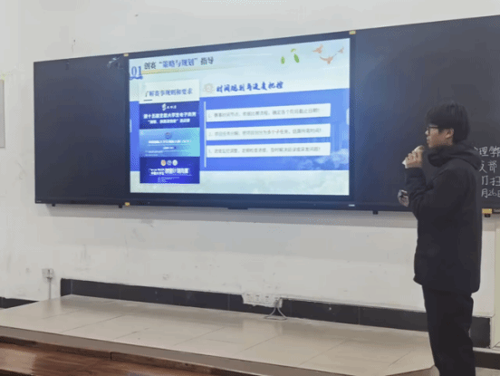 校青年创新创业发展中心副主席王晴慧首先对“卓越杯”及各大赛事向同学们进行了解读。她全面深入剖析了“卓越杯”创新创业赛事的主题内涵、多元赛道设置以及赛程安排的每一个节点提出要合理运用创新思维。她表示:“要累积经验,站在前人的肩膀上进行创新。”随后校青年创新创业发展中心副主席张帅则向同学们分享了创新创业的实用技巧,他从“创赛策略与规划指导”“个人能力与素质提升”“比赛PPT制作与优化讲解”三大板块进行讲解。让同学们深入学习了创新创业的前沿知识和宝贵经验。