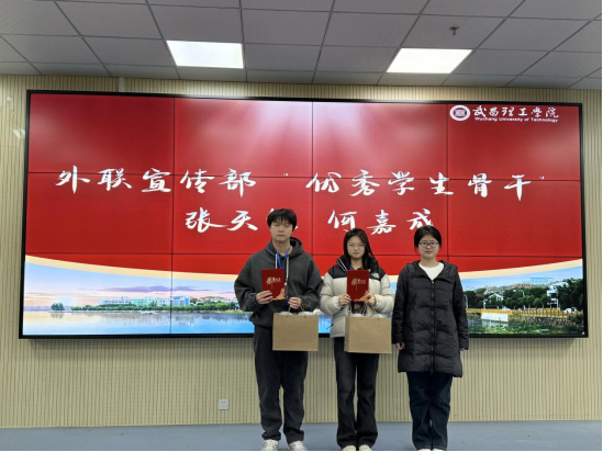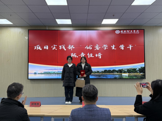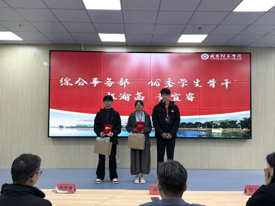 随后,主持人宣读了获奖名单。经过综合考评,最终授予综合事务部部长汤慧丽、外联宣传部部长赵文锐“优秀部长”称号,授予程渝茜、黄宣睿、陈青佳琦、张天佳、何嘉成、朱慧群“优秀学生骨干”称号。