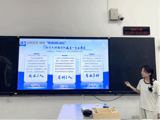 在分享环节,黄蒲敏同学通过复盘往届优秀项目,对项目的创新点与答辩技巧展开了深入剖析。其间,她提及“低空经济背景下光伏智能化检测”项目,该项目凭借技术创新与社会价值的双重优势在众多项目中脱颖而出。她着重强调了评委在项目评审过程中尤为关注的创新性、团队协作能力、答辩表现以及社会影响力,这些关键要素为参赛者明确了备赛的重要方向。