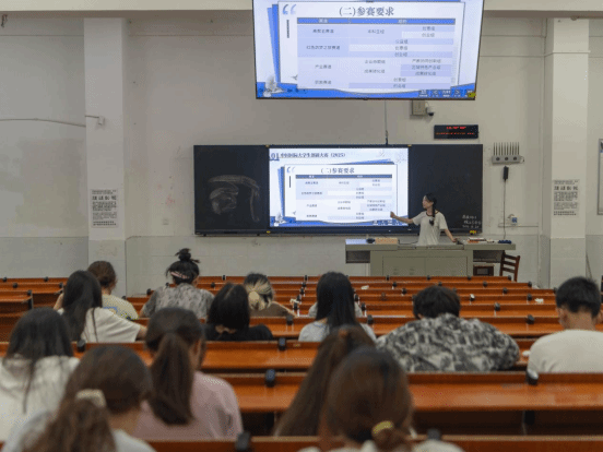 黄蒲敏同学凭借自己的参赛实践以清晰的逻辑架构与鲜活的案例展示,对国创赛的参赛流程及核心要点展开了全面剖析。自账号注册环节起,至团队组建、项目申报,再到内容设计等各个阶段,她均细致入微地指导同学们如何高效推进参赛准备工作。她着重指出,参赛项目应紧密贴合当前经济社会发展需求,充分体现高校“四新”学科建设所取得的成果,并聚焦“人工智能+”“低空经济”“生物技术”“量子科技”等前沿领域,以此推动产业升级与数字化转型进程。